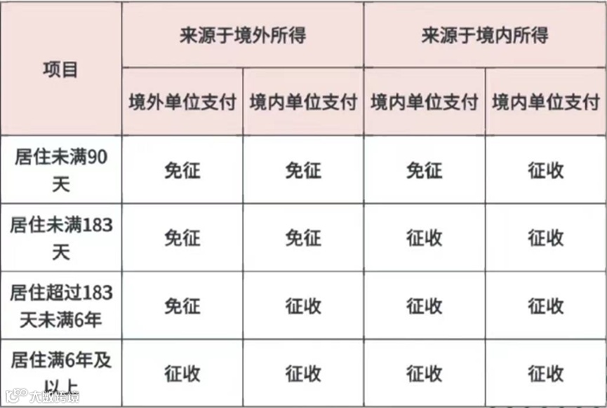 2.当居住超过183天未满6年时,需对所有境内所得进行缴税,境外所得中的境内单位部分缴税,境外单位部分不需缴税;
