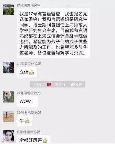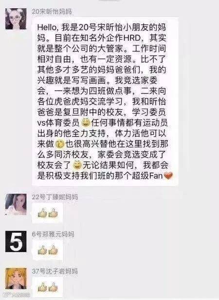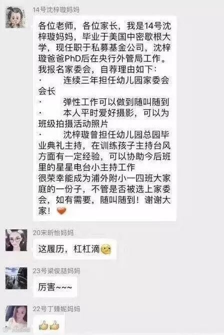 就像去年在网上热传的上海一所小学家长委员会的竞选截图,家长们各显神通,像孔雀开屏般展示自己对老师、对校方的用处,为了让孩子多得到一点照顾: