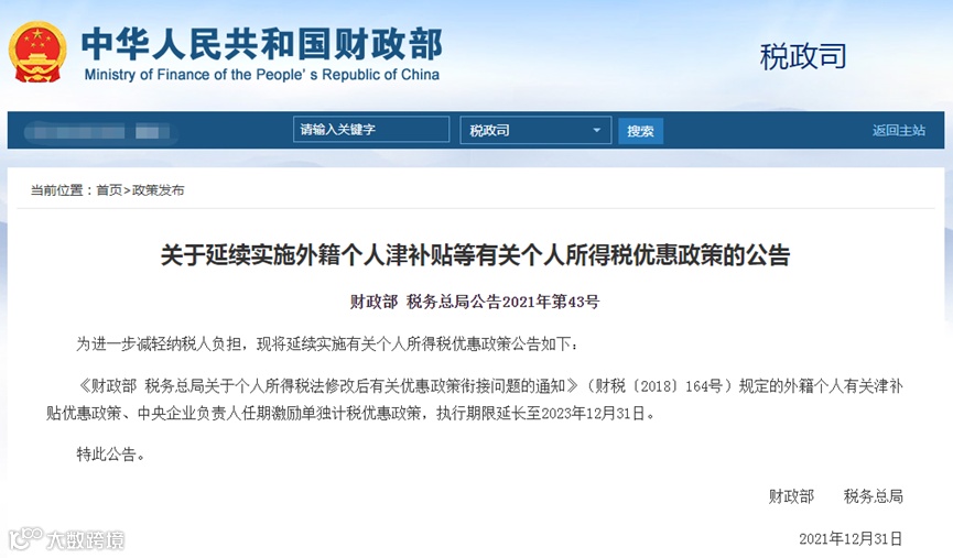 财政部税务总局发布的《财政部税务总局关于个人所得税法修改后有关优惠政策衔接问题的通知》中,规定的外籍个人有关津补贴优惠政策、中央企业负责人任期激励单独计税优惠政策,执行期限延长至2023年12月31日。