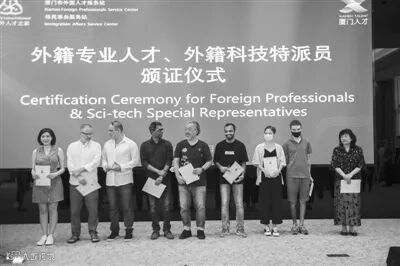 上月底,厦门市科技局联合市人社局、公安局和火炬高新区管委会在厦门市外国人才服务站进行了外籍专业人才、外籍科技特派员的颁证仪式。