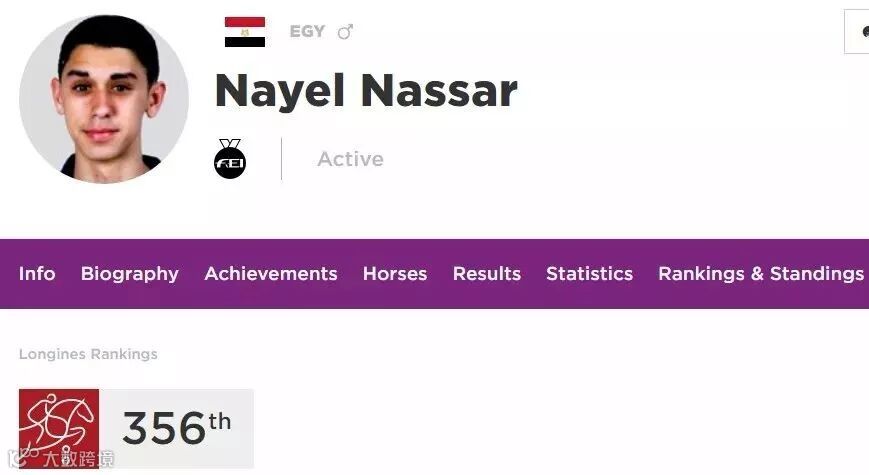这是Nayel小哥在国际马术协会的档案。照片应该是很久以前的,浪琴排名是365位。