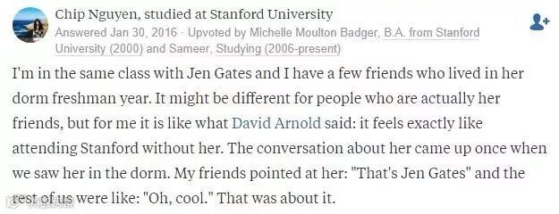 “我和Jen在一个班,也认识几个朋友第一年跟她住一间宿舍。可能对她的朋友来说比较不同吧,但是对我来说,斯坦福有没有她差别并不大。我们有一次在宿舍里看见了她,我朋友就指着她说,那就是盖茨的女儿。然后大家淡定的说,‘喔,挺好的’,就散了。”