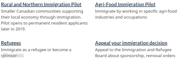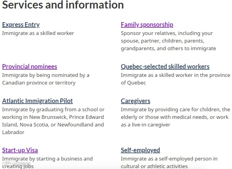 除了图中包含的项目,加拿大没有任何其他可以移民的项目了。所有的其他移民方案,都属于曲线救国达到这些项目要求之后再申请,但最终都会落实到这些项目中。按照从左到右从上到下的顺序,依次翻译下来就是:联邦EE、家庭团聚、省提名、魁省技术工人、大西洋试点、护工、创业签证、自雇、农村和北部试点、农业食品试点、难民。右下角最后一个是申诉入口,忽略。
