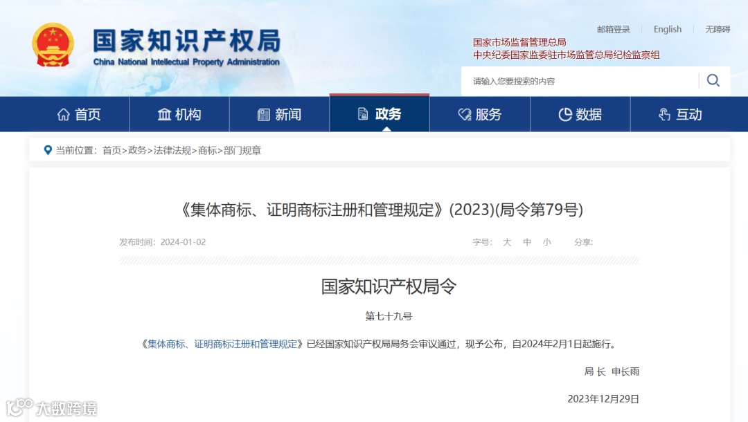 导读:第七十九号《集体商标、证明商标注册和管理规定》已经国家知识产权局局务会审议通过,现予公布,自2024年2月1