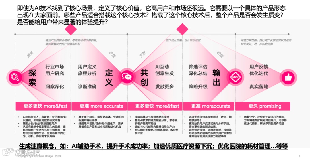 当下AI领域的痛点显著:“技术很牛,但落地难”,很多AI产品陷入“拿着锤子找钉子”的误区。黄蔚认为,破局关键在于“AI+服务设计”的双向奔赴——用服务设计的思维,为AI找到真场景、真需求。她以AI医疗手术辅助案例,拆解了具体落地的“三步法”: