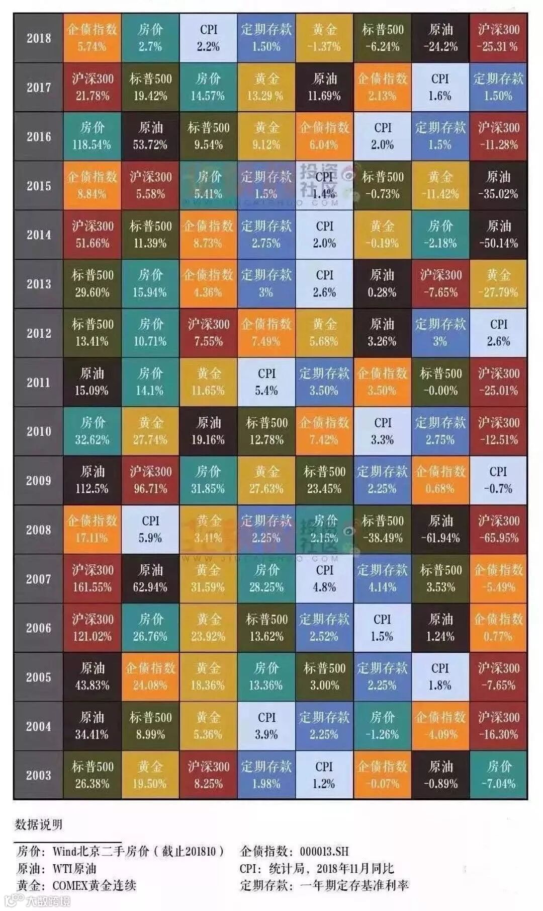 但是由于持单一货币资产这件事风险又很大,所以许多人更愿意进行全球资产配置。下面是2018年全球大类资产历年收益图。