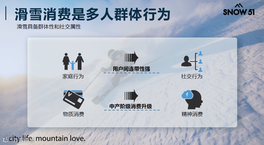 滑雪源于运动,但几乎没有人滑雪是出于健身锻炼的目的,它可以是为了和朋友社交、也可以是去 have fun ,或者是去和家人度假的,它是一种完全不同的运动,是 enjoy life 的一种方式。从这个角度来看,也印证了当下需求的转变——从物质追求到精神体验追求。