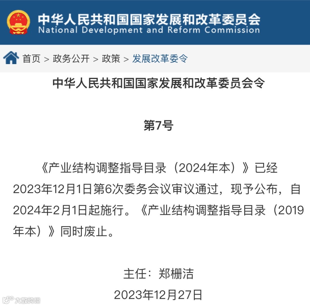 近日,国家发改委发布《产业结构调整指导目录(2024年本)》,自2024年2月1日起施行。《产业结构调整指导目录(2019年本)》同时废止。