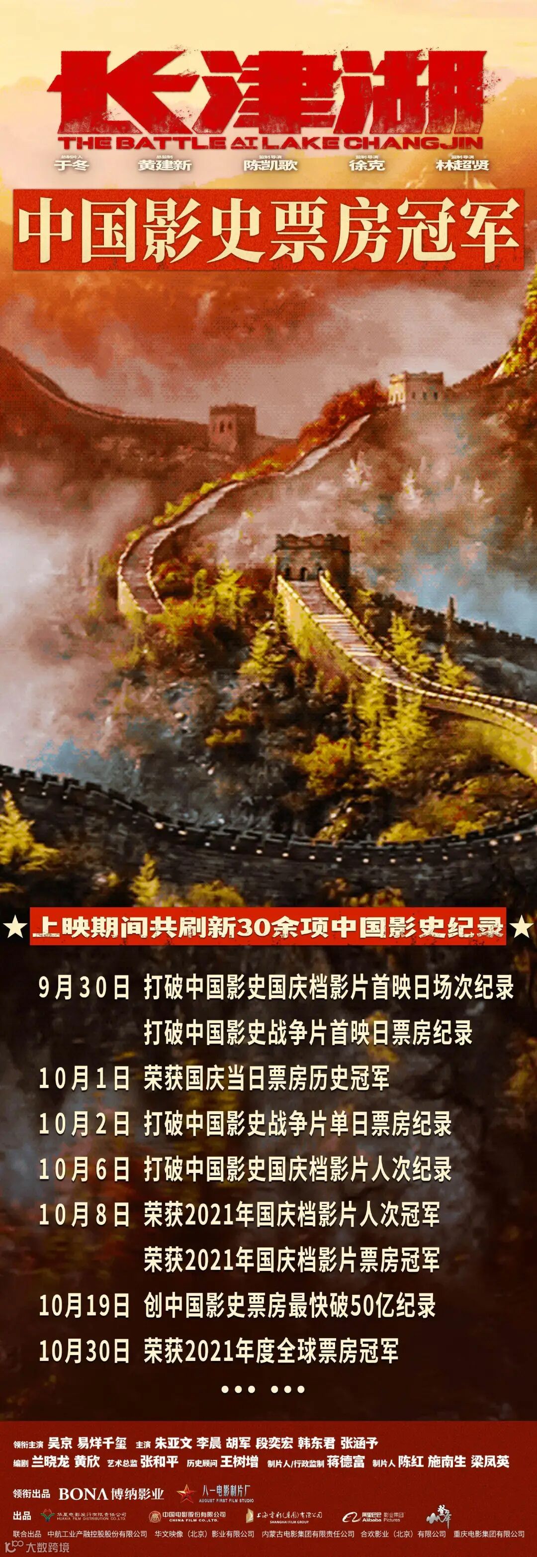 打破多项影史记录,《长津湖》在上映57天后成功登顶冠军。