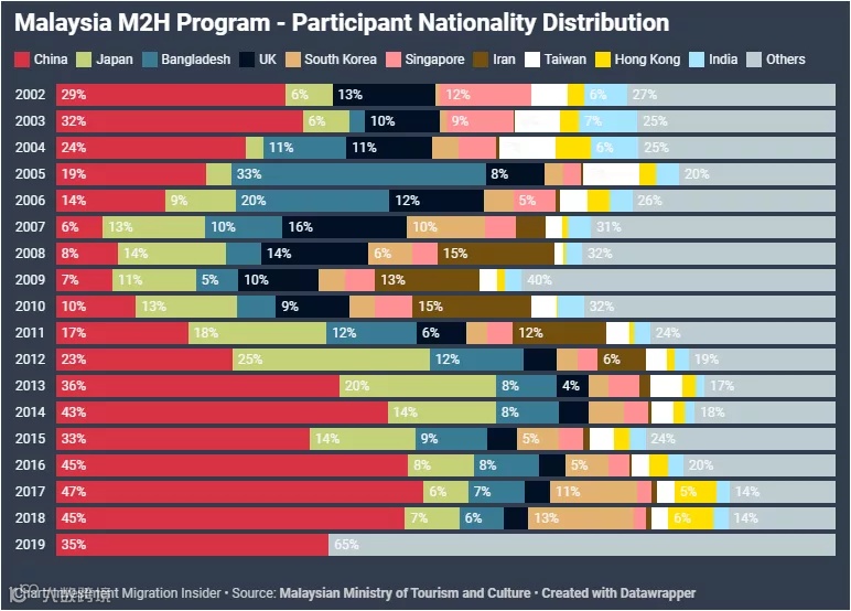 据马来西亚旅游和文化部副秘书长透漏,去年中国大陆公民约占第二家园项目所有申请量的35%,此外,前10的申请人来源国/地区还包括韩国、香港、日本、孟加拉、英国、新加坡、美国、台湾、印度,但没有透漏各个国家/地区的具体数字。