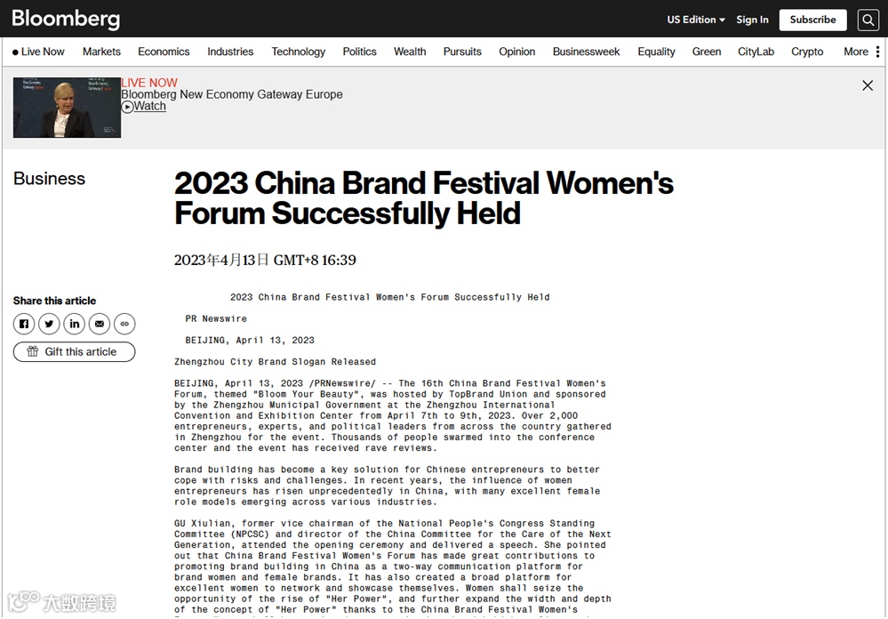 此外,涵盖英、西、法、德、日等多种语言的彭博社、雅虎财经、美通社、美国福克斯广播公司、欧洲通讯社、德国财经新闻网、日本《朝日新闻》、新加坡时代周刊等683家海外媒体也进行了关注与报道,触达潜在读者总数约3.37亿人。