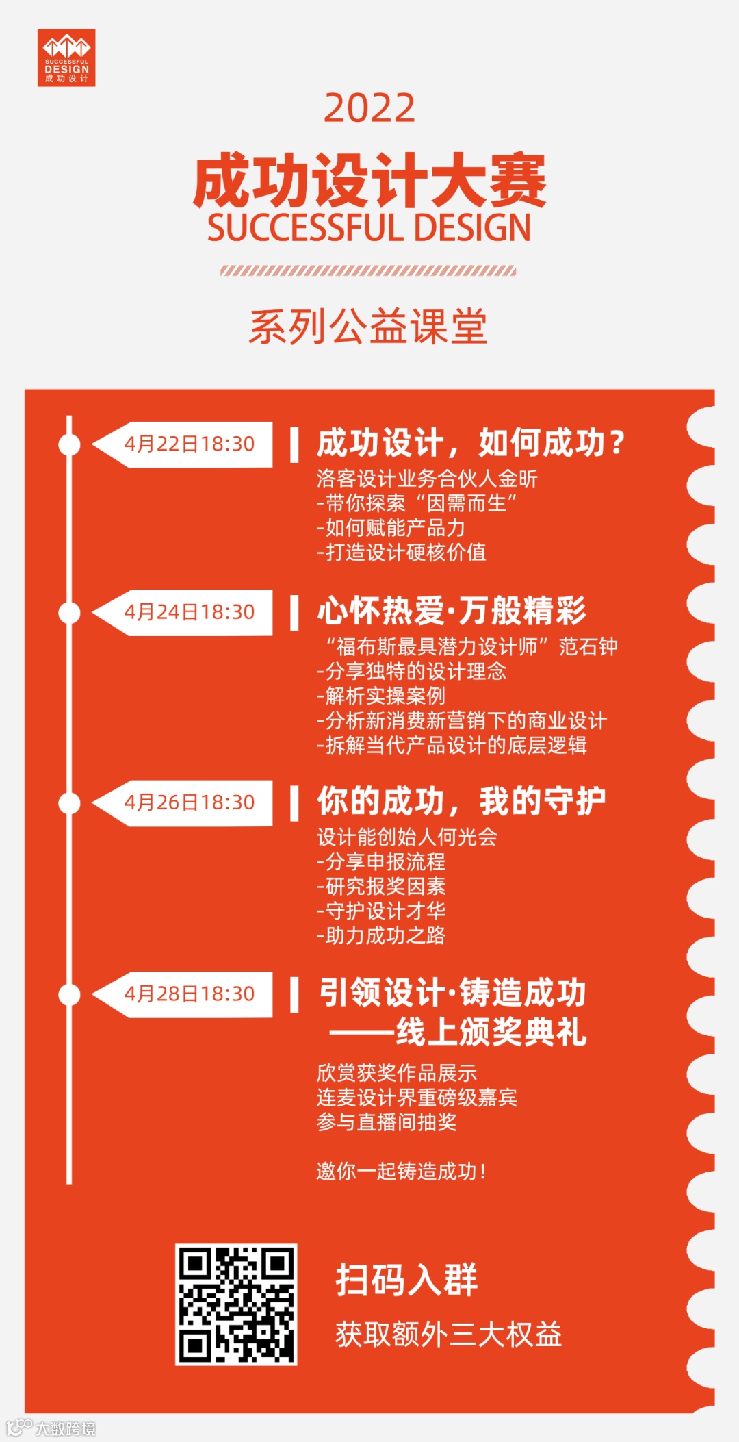因疫情的阻碍,原定于2022年6月在上海举办的颁奖典礼将改为线上形式,因此成功设计大赛组委会在此邀请你参加2022年4月28日 18:30的【引领设计·铸造成功】线上全球直播颁奖典礼。