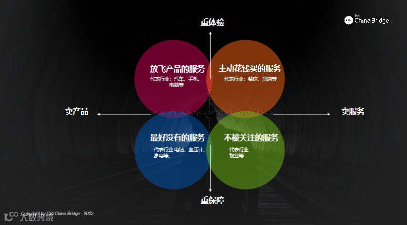 - 用户对一些产品的想法是“当产品质量出现问题,我需要寻求服务,所以我希望我买的产品永远都不会坏,这样我也永远不会需要服务。”这些以传统产品为代表的行业为主,卖产品且重保障,意为“最好没有的服务”。
