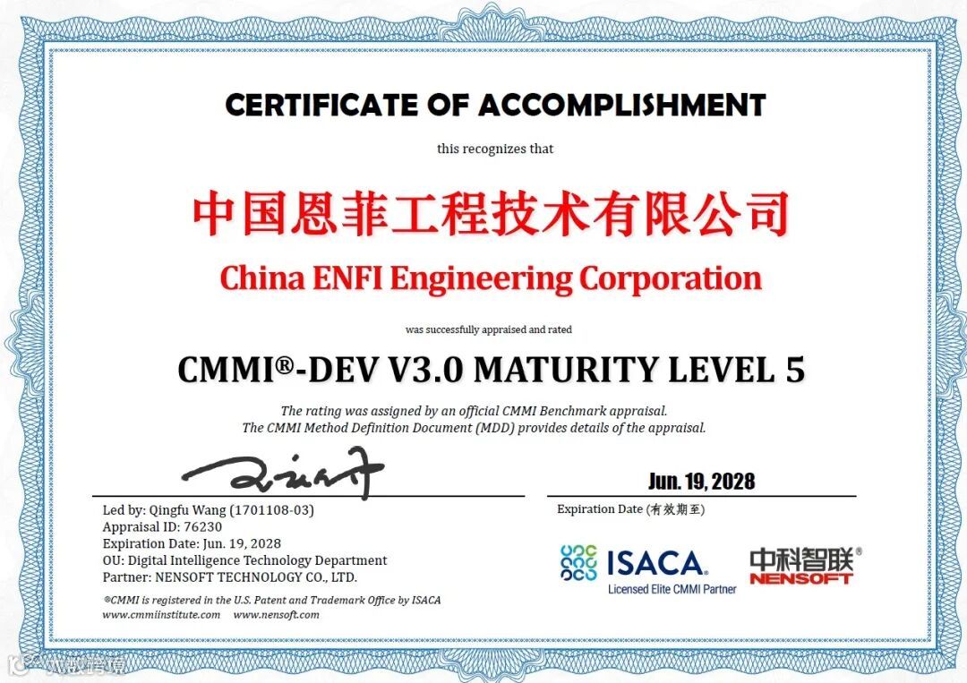 近日,中国恩菲通过全球软件领域CMMI V3.0成熟度五级(简称“CMMI5级”)认证,标志着公司在软件开发及项目管理能力方面达到国际先进水平,能够为客户提供更高质量、更成熟的数字化软件产品及服务。