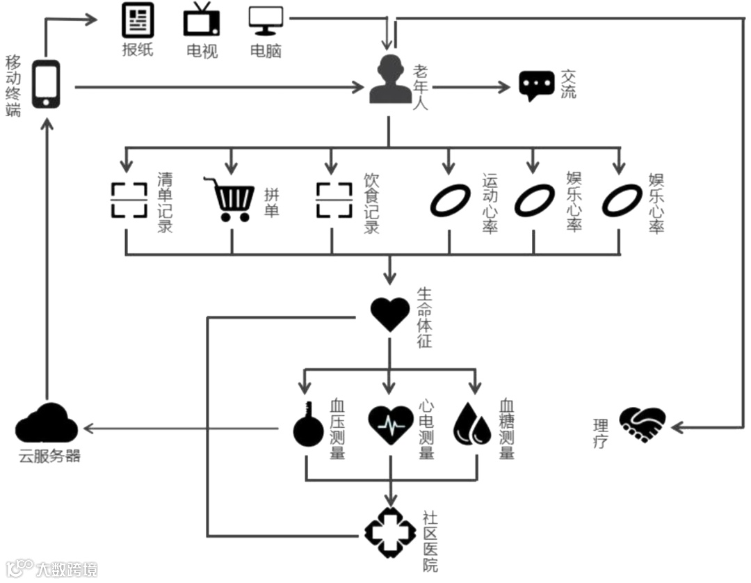 以手机为载体,监视老年人生命体征,自我管理,康复、运动、日常锻炼等子系统。