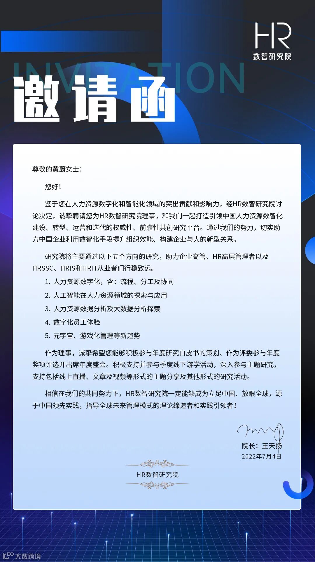 作为HR数智研究院理事,黄蔚将积极参与年度研究白皮书的策划、作为评委参与年度奖项评选并出席年度盛会。积极支持并参与季度线下游学活动,深入参与主题研究,支持包括线上直播、文章及视频等形式的主题分享及其他形式的研究活动。