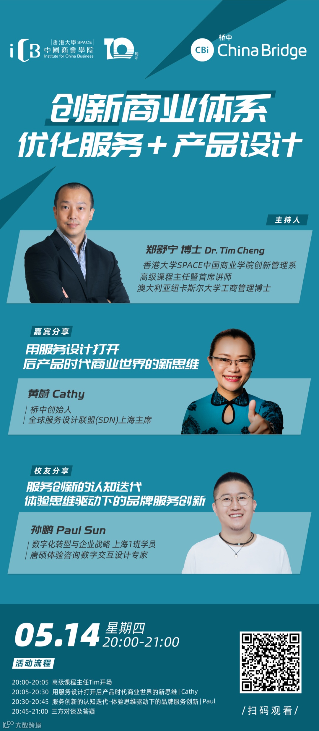 香港大学 SPACE 中国商业学院(简称港大 ICB)隶属香港大学 SPACE 学院,是亚洲富有特色的创新型专业商管学院,以“专业深度决定未来高度”为发展定位,致力于为内地培养创新型和具国际观的专业人才及管理领袖,是香港大学践行「为中国而立」创校校纲的实际举措,更是香港大学中国发展战略的重要内容。 本周四,桥中创始人、全球服务设计联盟(SDN)上海主席、成功设计平台联合创始人黄蔚受邀做客港大ICB直播平台,与我们分享如何用服务设计,从有形到无形,从创新赋能到协同共创,从洞察痛点到设计落地,创造可持续的商业和社会价值。用服务设计,打开后产品时代商业世界的新思维,洞悉服务创新,突破增长极限。 黄蔚相信,要么设计,要么被设计! 扫描图上二维码,立即观看精彩的直播内容!