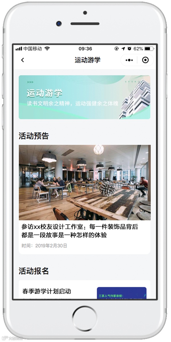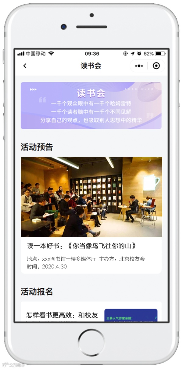这是一个学习平台也是一个信息窗口。搜罗校内各类培训、讲座、资讯进行实时发布,使校友与母校、与校友连接更紧密。