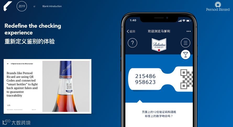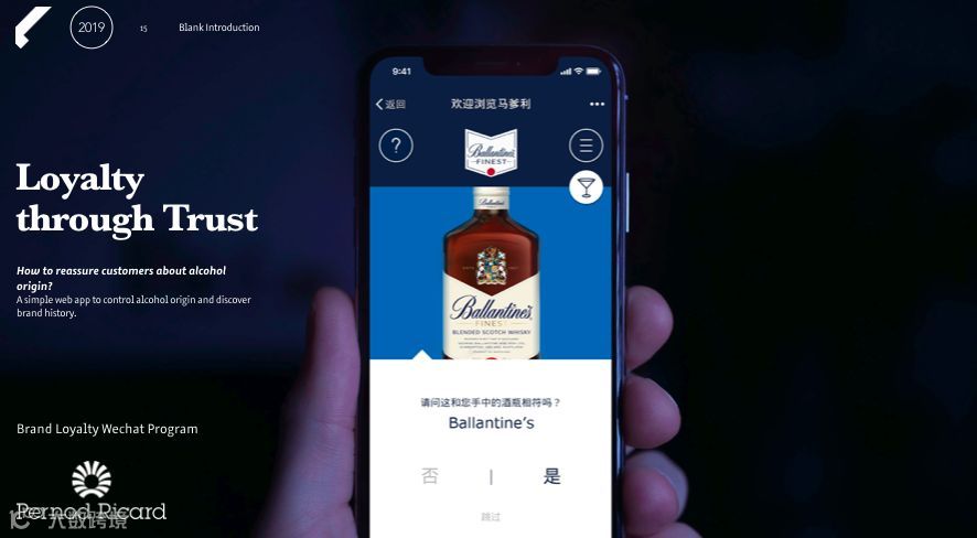 同时也因为这种“山寨”现象,Blank 曾与 Pernod Ricard (保乐力加)合作,针对在中国有30%的 Pernod Ricard 是赝品的现象提出解决方案。我们结合微信小程序和微信二维码设计了一款能甄别产品真假的数码端解决方案。