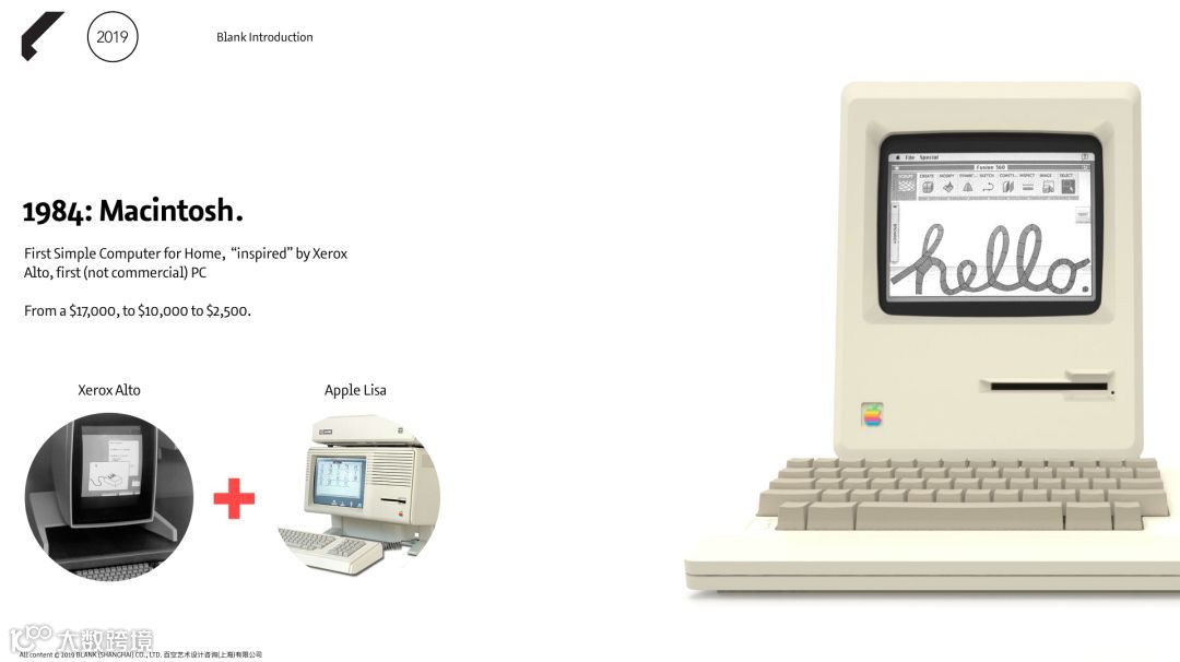 同样的,1984年乔布斯和苹果产品团队,发明了第一台民用电脑Macintosh。当时提取的灵感来源于 Xerox Alto 和苹果自家产品 Apple Lisa。相比商用电脑高昂的产品价格17000至10000美元,Machintosh 2500美元的定价,成功地奠定了民用电脑的开端。