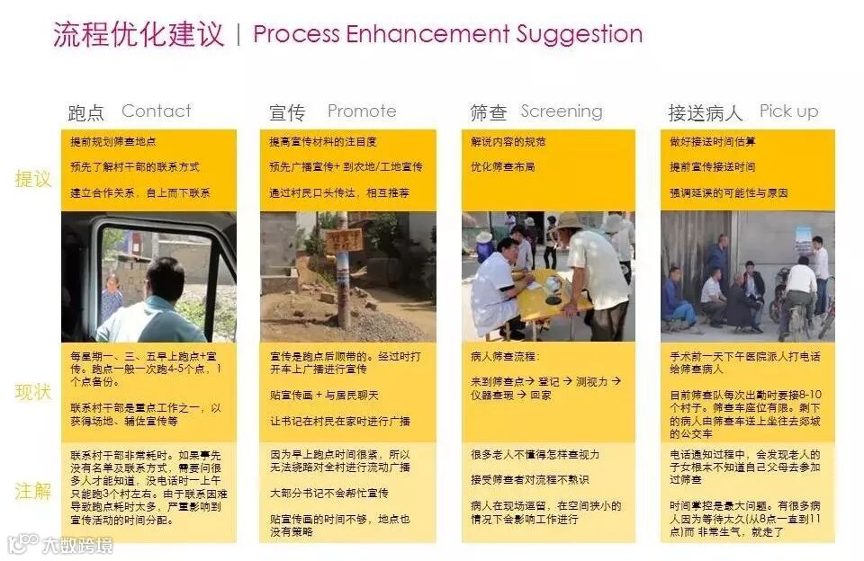 桥中创新的团队与ViP进行了详细的访谈,意识到想要扩大社会效益,提高白内障患者做手术的比率,首先需要找出患者不做手术的原因;继而,考虑到ViP是否已经触及到足够多的患者,患者对手术的认识及带来的改变是否明确等问题。为此,桥中创新设计了一套全新的调研方式,重新审视ViP整个业务流程和触点设计,以求提高整个ViP下乡的获客和转化,让项目可以惠及更多白内障患者。