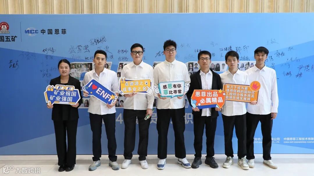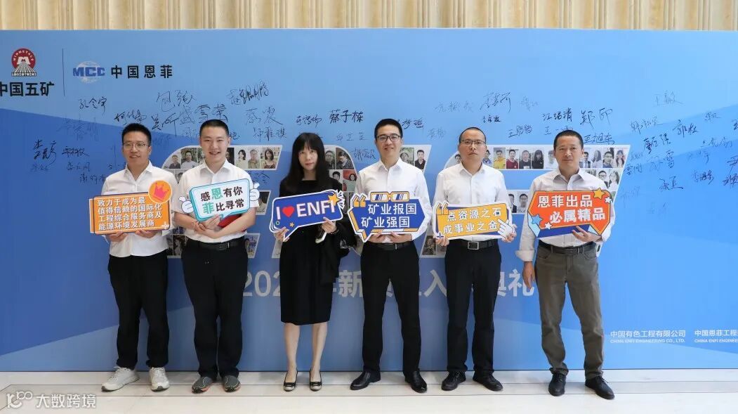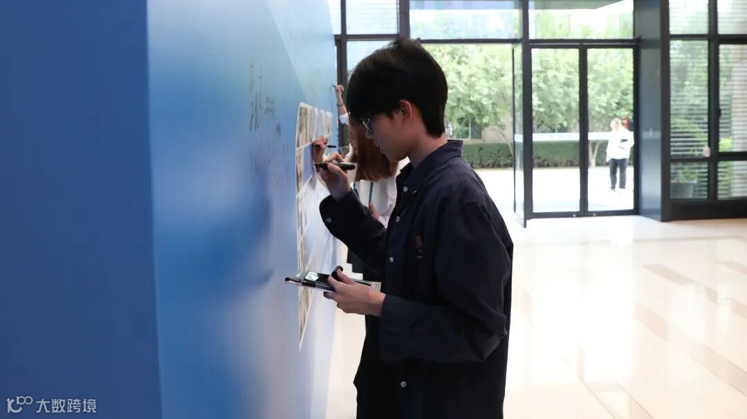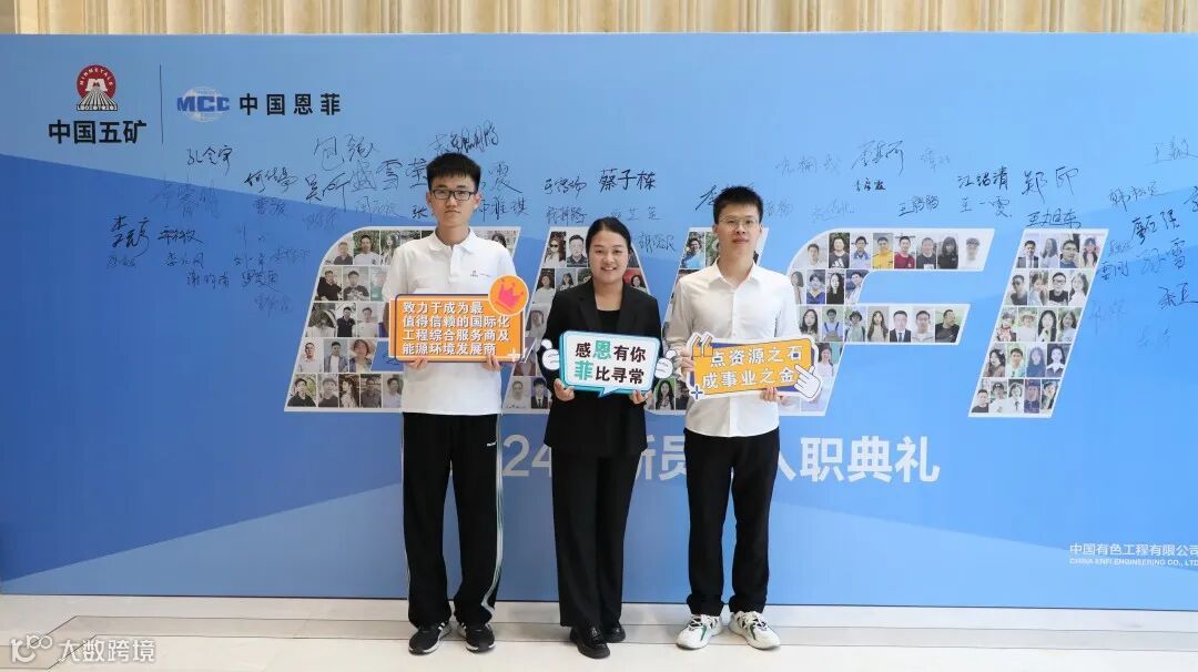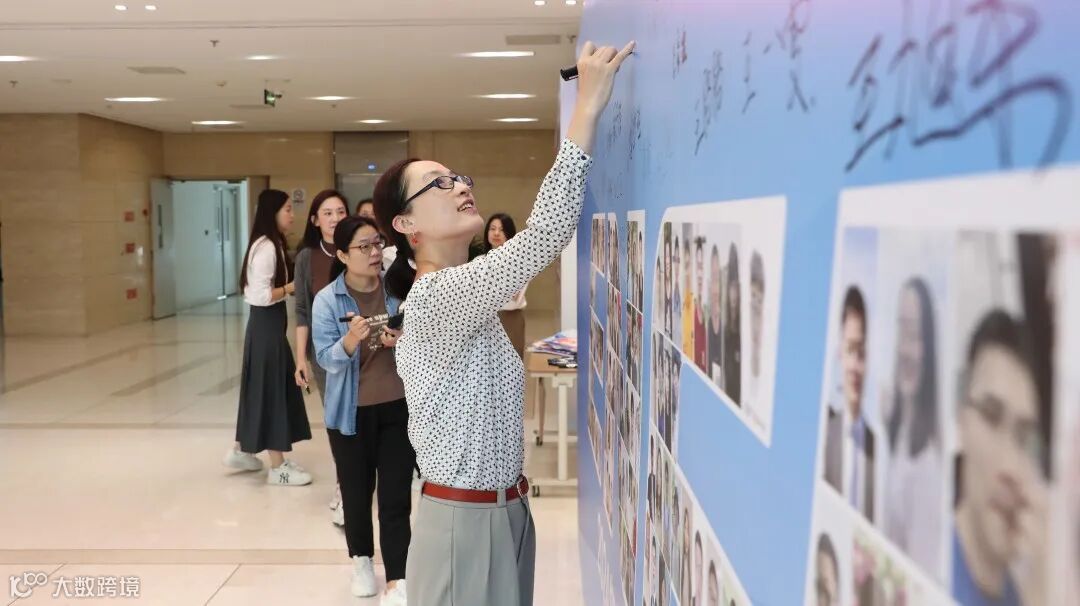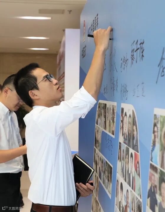 典礼前,新入职员工在签名墙上签名并合影留念。