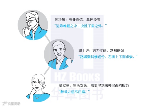 于是我们将这些客户分成三类,分别是运筹帷幄的周决策、努力奋进的郭上进和需要得到精神层面服务的林安享。