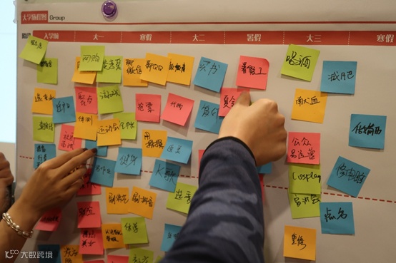 邀请多位大学生参与共创,真实用户的参与让团队随时直面现实。以穷举的方式, 把学生在大学里做过的所有事,交学费、打工实习、上课等写在一张张便利贴上,将学生的关键记忆梳理在大学时间线上。这就是大学生活的地图, 也是要做的这个产品的世界地图的雏形。