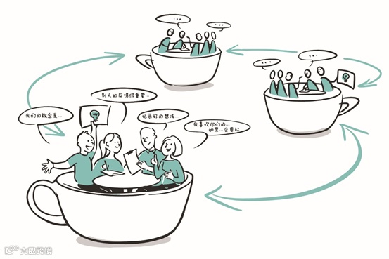 5.几轮后所有小组在一起进行一次全体汇谈。这是一个大家共同反思的机会。到处走动产生的想法也会改变参与者们的常规思维模式,放弃起初固守的立场和想法。