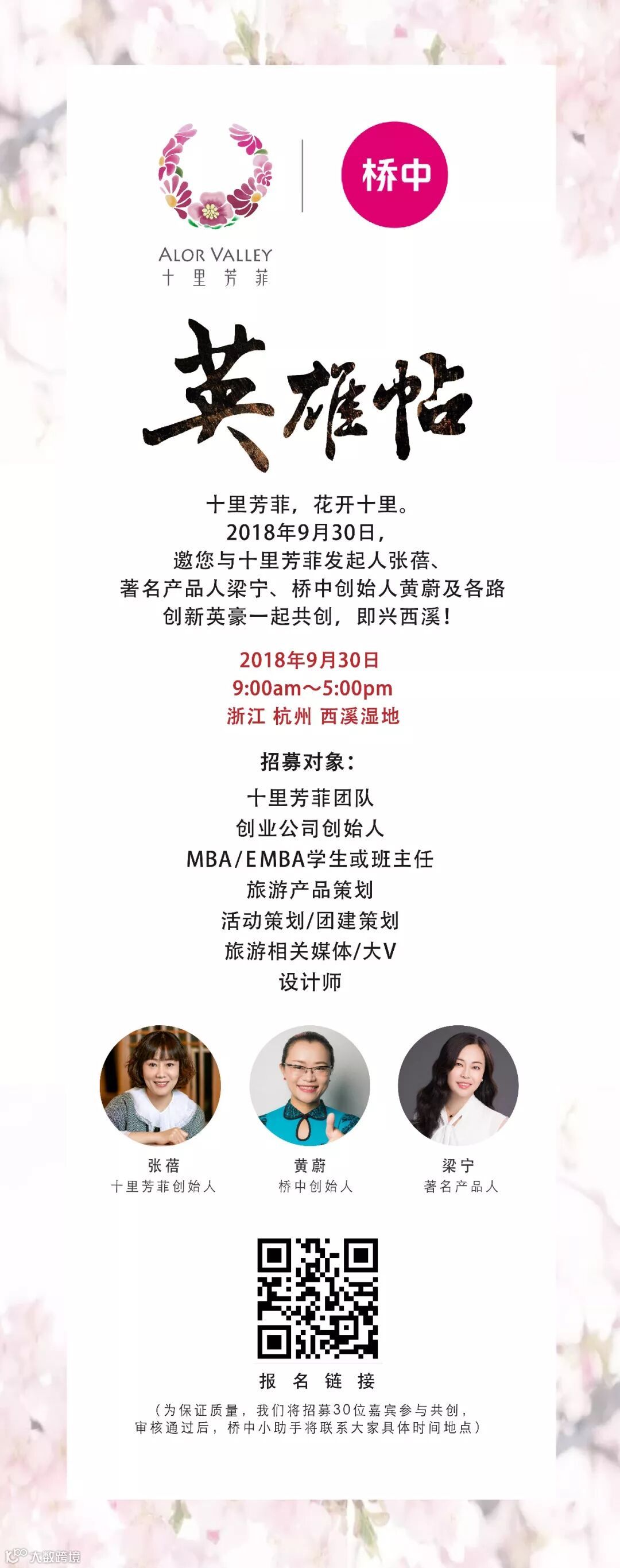 2017年8月,桥中和十里芳菲的第一次合作,召集了十里芳菲跨部门的运营者、管理者、投资人,统一了项目战略和内部生态;第二次,我们召集了艺术家、即兴表演者、生活美学创业者、设计师、人类学家等不同类型的创造者,提升十里芳菲的趣味性、调性;这一次,我们招募创业公司创始人、MBA/EMBA/旅游大V,且男女搭配,让这个已经俘获无数女性芳心的十里芳菲能进一步网罗天下英杰的雄心,让跨界者再度碰撞,产生闪电般的火花。