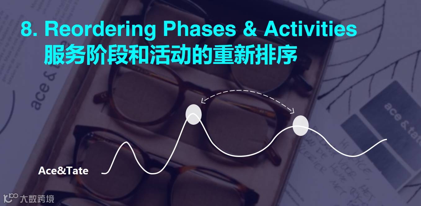 8. 服务阶段和活动的重新排序:Ace & Tate眼镜意识到真正的关键时刻其实发生在购买之后,在购买之前客户并不知道效果好不好,所以他们决定对调支付和使用的顺序,先提供试用服务,客户最多可以把5副眼镜带回家试用5天,然后再决定是否购买。当客户带上眼镜去上班,如果有人夸赞眼镜很不错,他会很高兴,觉得自己选对了眼镜。