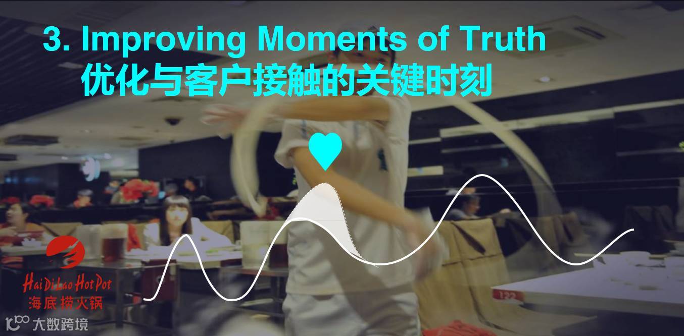 3. 优化与客户接触的关键时刻:海底捞火锅就是一个非常棒的例子,海底捞的拉面绝活,拉面小哥曼妙妖娆的姿势,成为很多客户来海底捞过生日的理由。与客户接触的关键时刻并不会偶然发生,而是被精心设计,从而被人们广泛传播以及在自身组织里逐渐固化的。