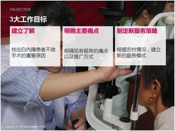 我们和VIP机构沟通后发现,印度和中国社会之间的社会和文化上的差异,可能使印度的创新医疗营运模式对中国人无效。当你把一个产品或服务引入市场时,你必须考虑到社会和文化背景。因此我们为VIP机构定义了三个迫切需要做的目标,以提高手术的转换率: