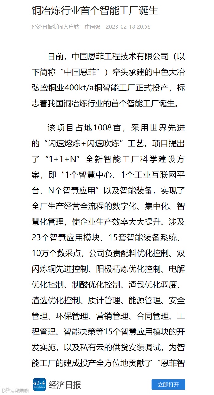 2月18日,经济日报报道由中国恩菲牵头承建的中色大冶弘盛铜业400kt/a铜智能工厂正式投产。
