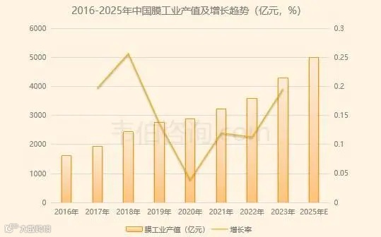 韦伯咨询预测,2025年我国膜产业市场规模或将达到5000亿。而其核心领域的膜材料,普华有策最新数据表示,我国膜材料及相关制品领域的产值2023年已经达到了1100多亿。