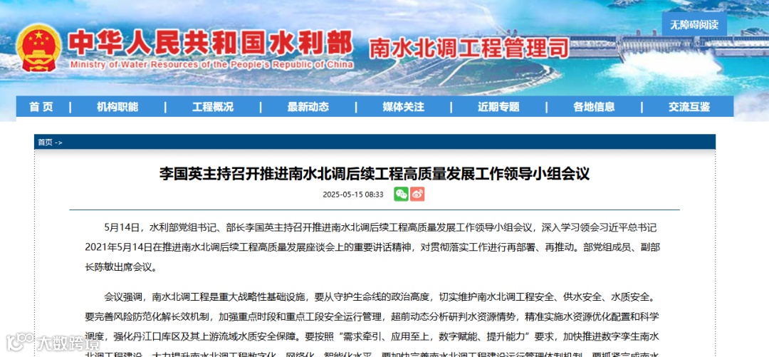 5月14日,水利部部长主持召开推进南水北调后续工程高质量发展工作领导小组会议,强调要从守护生命线的政治高度,切实维护南水北调工程安全、供水安全、水质安全。