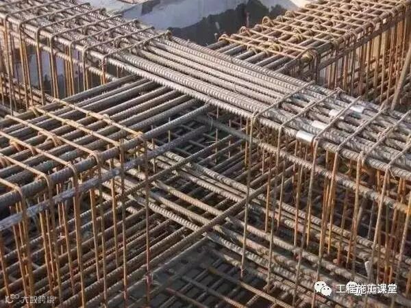 (2)梁柱节点处钢筋密集,绑扎梁筋时先插底筋,然后绑扎柱箍筋,再插梁上铁。