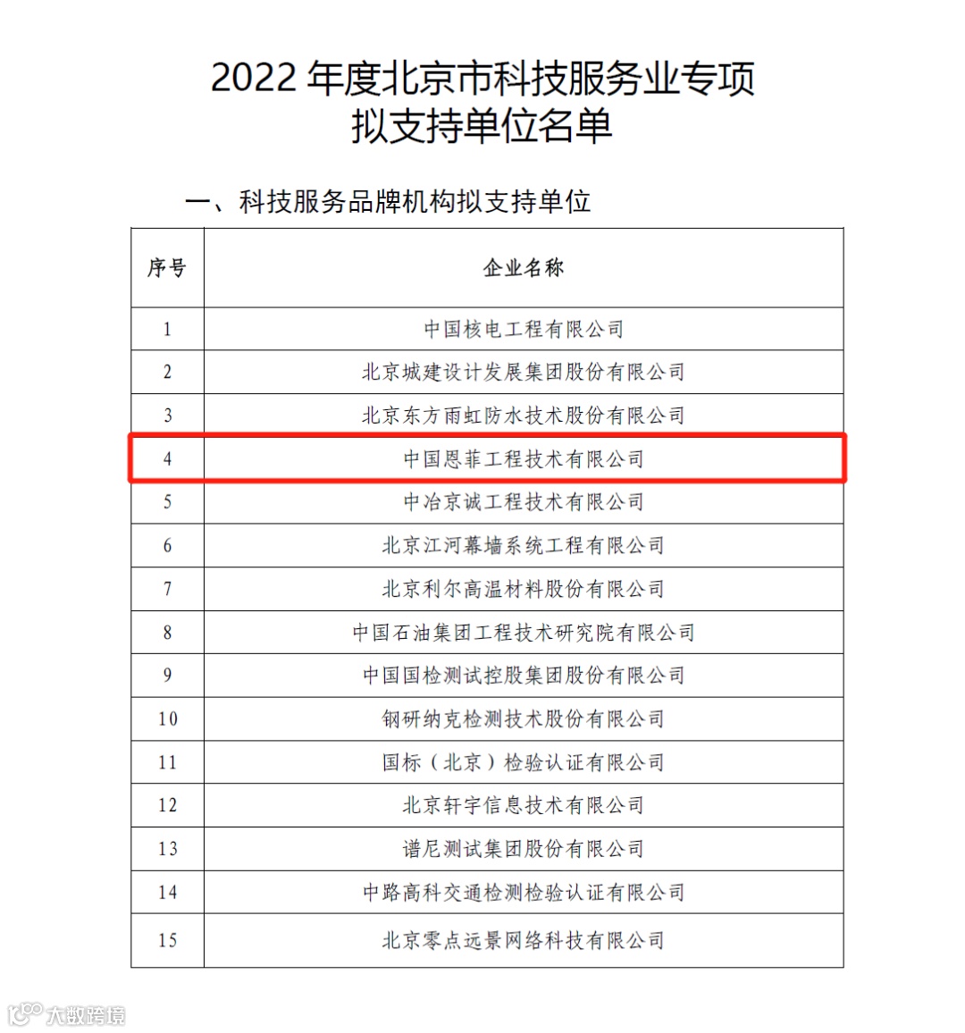 近日,经过公开征集、专家评审、公示等一系列严格程序,中国恩菲成功入选由北京市科学技术委员会、中关村科技园区管理委员会公布的2022年度北京市科技服务业专项支持单位名单,是有色行业唯一入选单位。入选后,公司将发挥自身科技创新和技术服务优势,为推进北京市生态文明建设与高质量发展发挥支撑作用。