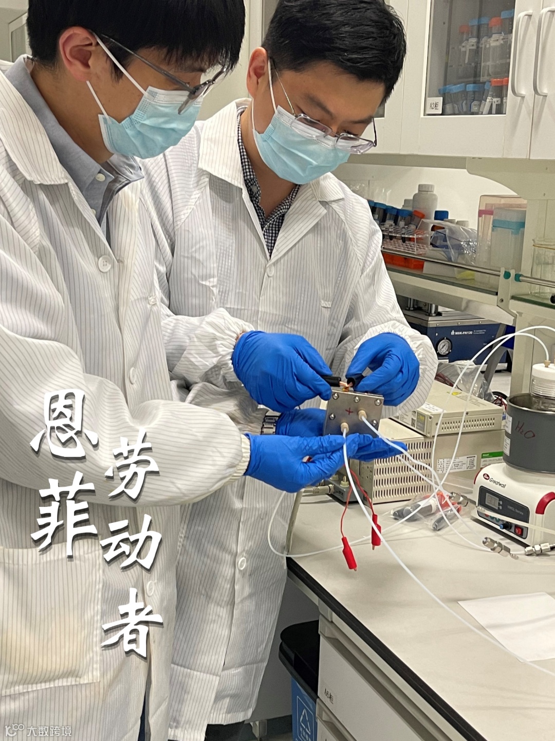 恩菲研究院韩治成和张城博士正在组装电解水制氢质子交换膜电解槽原型装置。