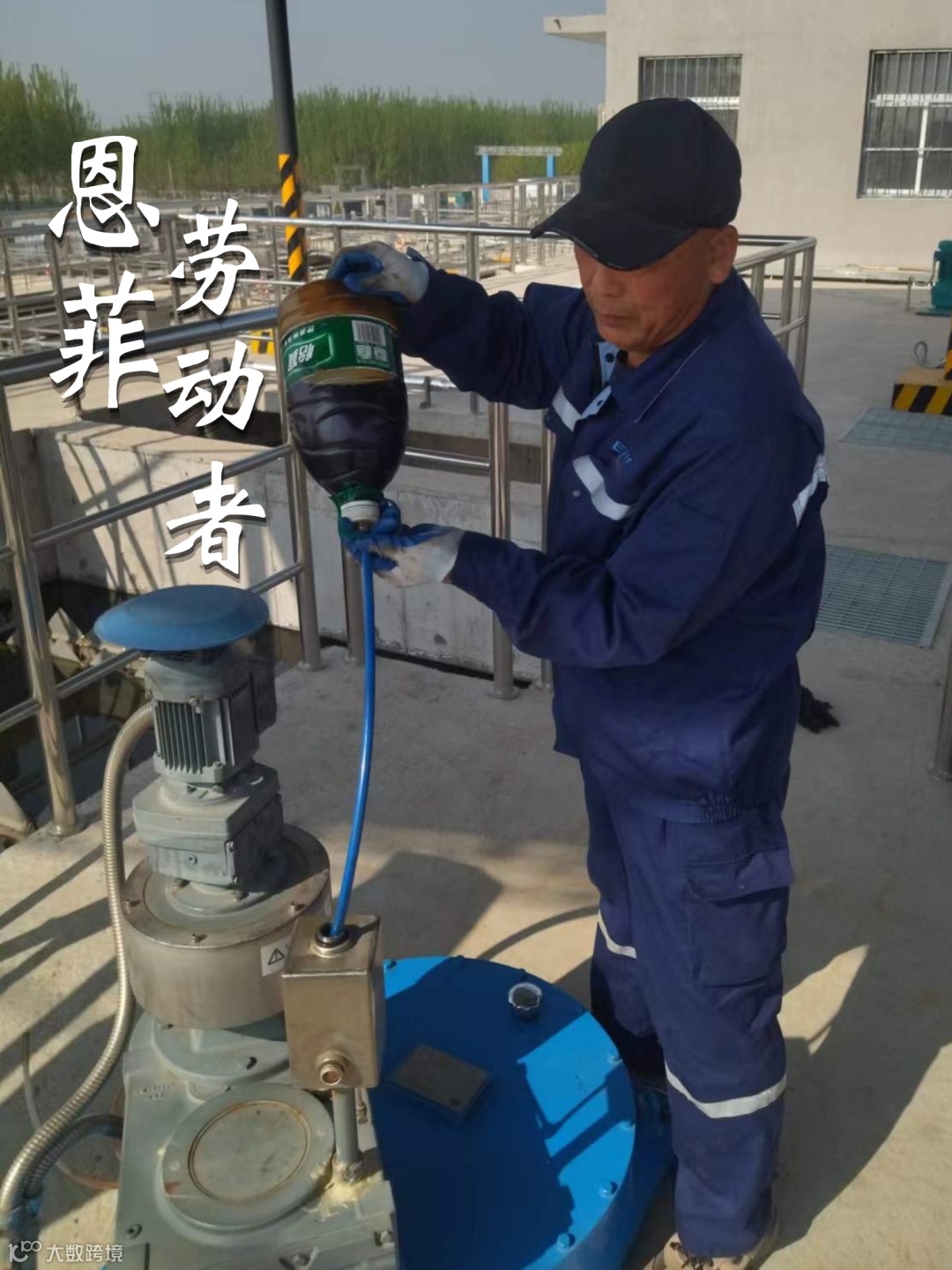 恩菲环保机修班组杨瑞生在雄安上游水源保卫重点项目对设备加注润滑油进行保养。