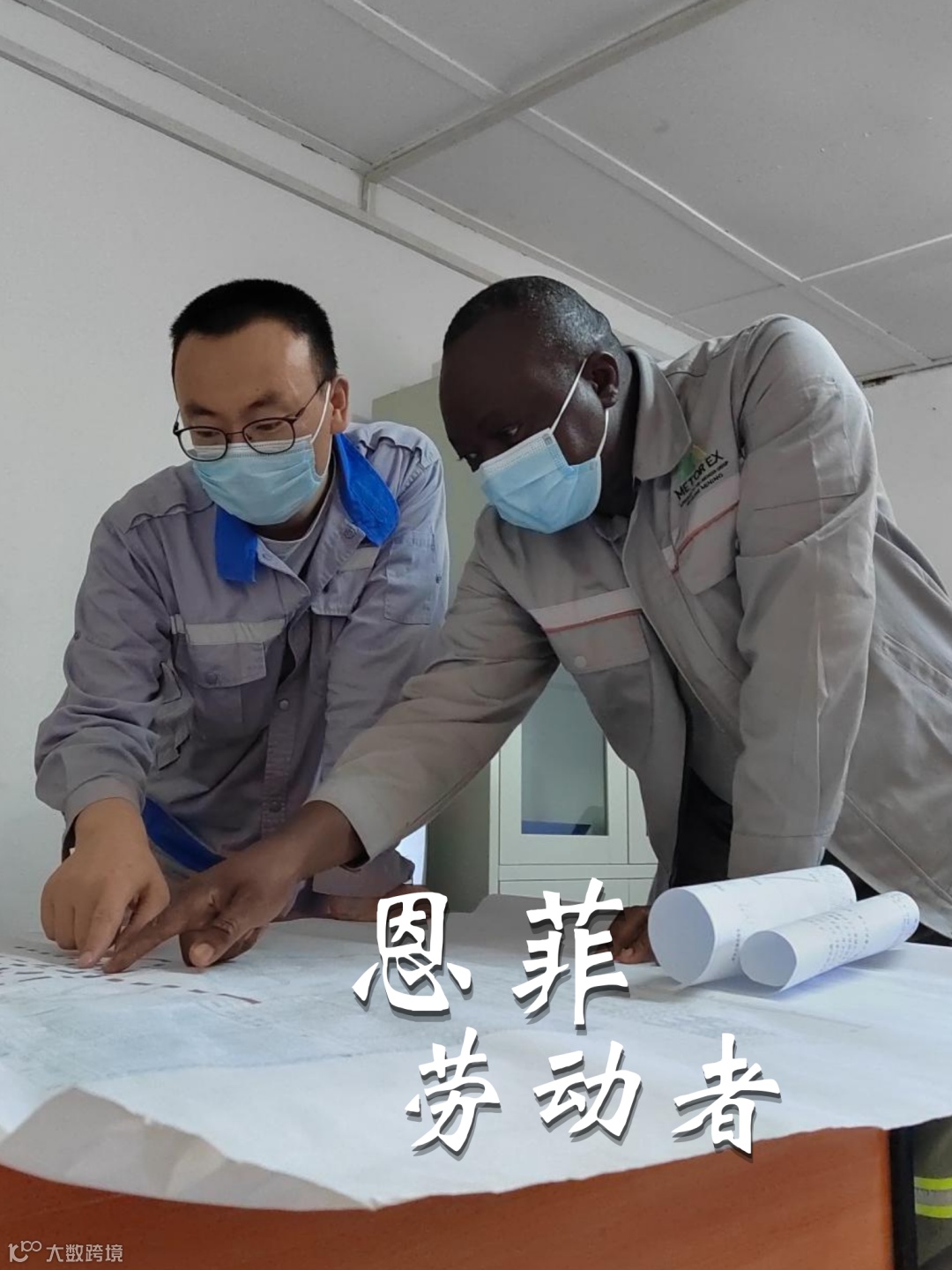 矿山事业部选矿专业冯建伟(左一)与采矿专业胡达涛(左二)在厄立特里亚阿斯马拉铜金多金属矿项目与工作组讨论矿区平面布置图。