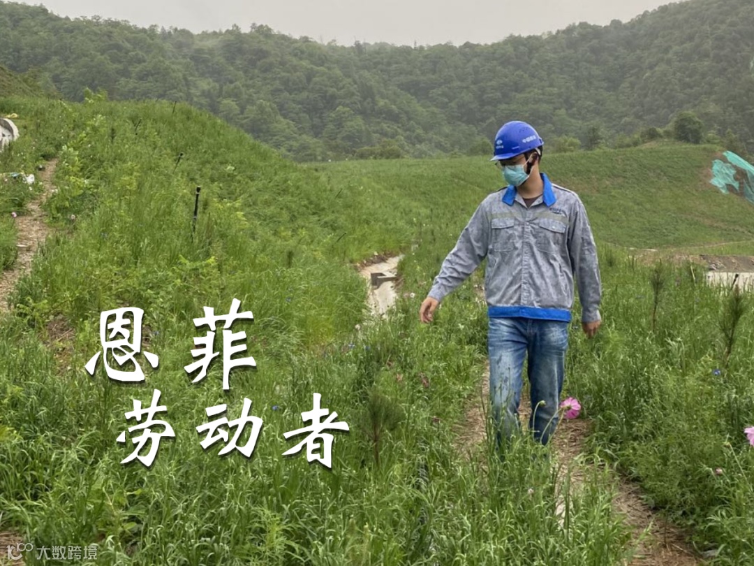 生态环境事业部现场管理人员屈敏正在检查银山矿业露采采区及排土场生态治理工程的养护设施及植物生长情况。