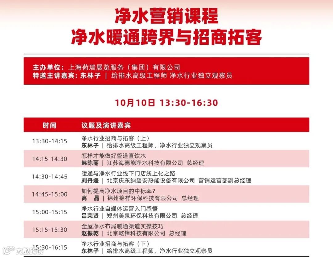 同期举办多场行业主题论坛,涵盖非常规水源、膜分离技术、煤化工水处理、冶金废水、市政排水、建筑给排水、校园饮水安全、净水营销等热门主题,为来自全国各地的优质商家、买家、专业观众打造一个集买家会晤、商贸洽谈、高峰论坛、媒体曝光、现场交易等功能为一体的高品质水处理商贸平台!