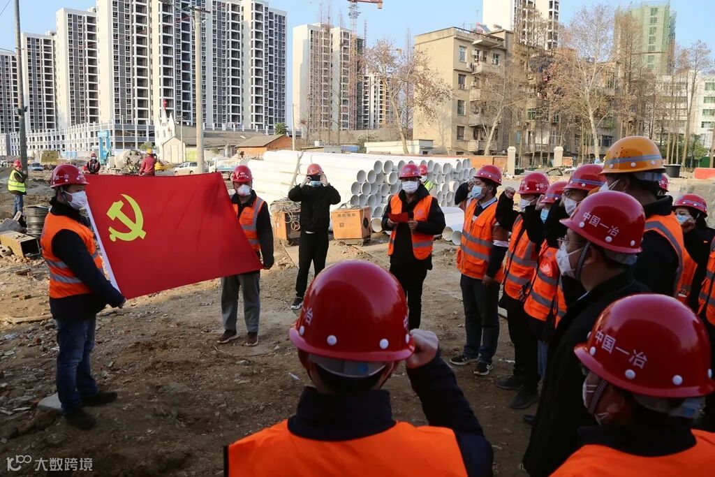 2020年2月13日,鄂州雷山医院建设现场,中国一冶5名同志火线入党,淬炼初心,现场全体党员重温入党誓词,铮铮誓言,愿为先锋。
