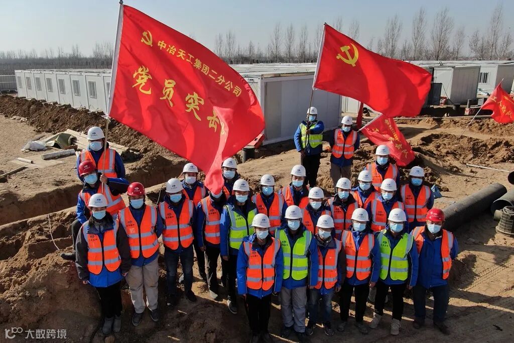 2021年1月,中冶天工建设方舱医院过程中,党员同志轮流驻守现场,不惜一切代价,不讲任何条件,党旗高扬一线,党员冲锋前线。