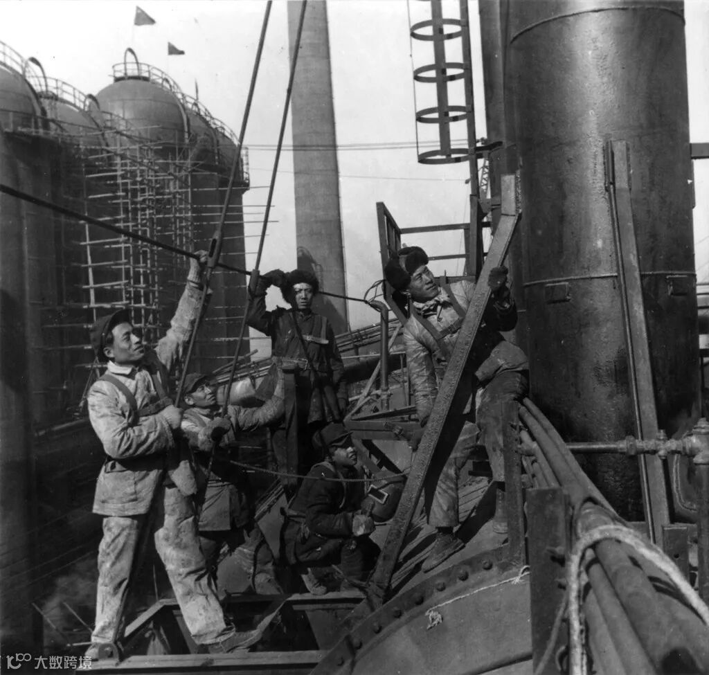1953年,架工正在安装鞍钢八号炉的瓦斯遮断阀。