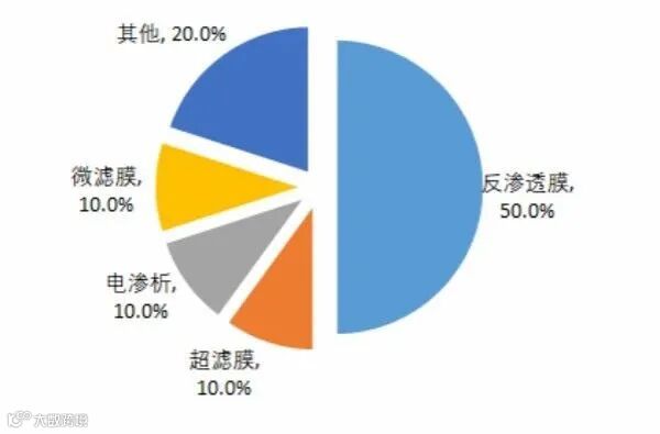 在国内膜的总销售中,50%以上的市场被反渗透膜(RO)与纳滤膜(NF)占据,超滤(UF)、微滤(MF)与电渗析各占10%,剩下20%被气体分离膜、无机陶瓷膜、透气膜及其他类型所占据。