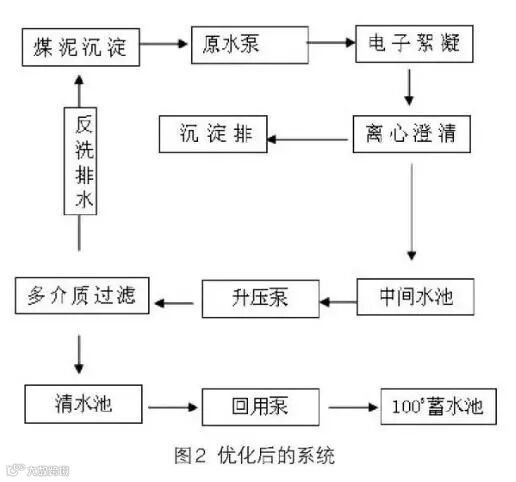 含煤废水汇集后,设置“原水泵—电子絮凝—离心澄清—沉淀排”及“原水泵—电子絮凝—离心澄清—中间水池—升压泵—多介质过滤—反洗排水—煤泥沉淀”两个回路,消除煤水沉淀不清造成的煤炭损失,使含煤废水里的煤炭得到回收利用,降低火力发电厂热值损耗,节约煤炭资源。