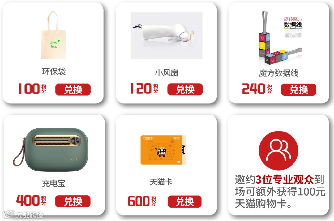 积分可在展期现场直接兑换天猫购物卡、充电宝、魔方数据线等精美礼品。礼品展示仅供参考,以现场实际发送实物为准。