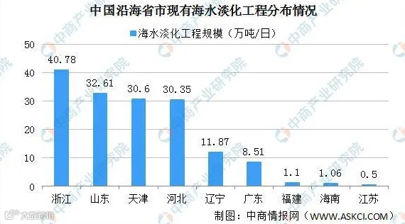 截至2019年底,全国海水淡化工程分布在沿海9个省市水资源严重短缺的城市和海岛。浙江现有海水淡化工程规模最高达40.78万吨/日。